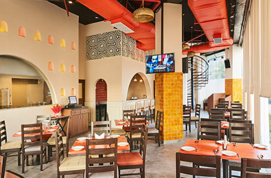 Norenj announces its presence with a distinctive arched canopy and transparent glazing that dissolves the boundary between street and interior. The façade’s clean geometry and material palette are softened by curated planters and warm exterior lighting, crafting a welcoming threshold from the energy of SS Plaza into a more immersive, ambient interior. This seamless transition reinforces the restaurant’s ethos of openness and flow—drawing guests into a space where architecture and atmosphere converge effortlessly.